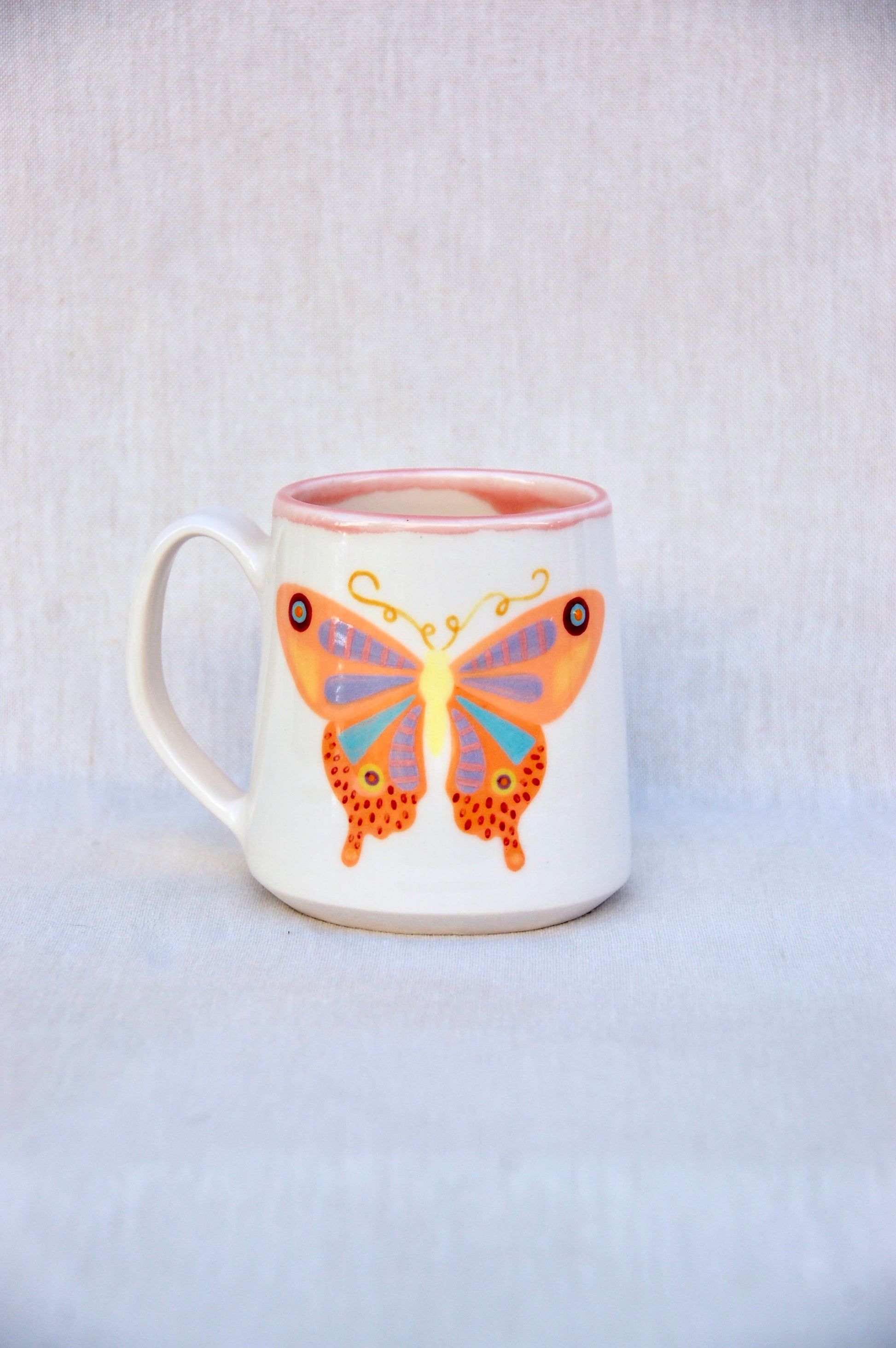 Butterfly Mug No. 1 features a hand-painted butterfly with abstract shapes and patterns, and yellow swirly antennas on a porcelain mug. Includes the signature pink rim