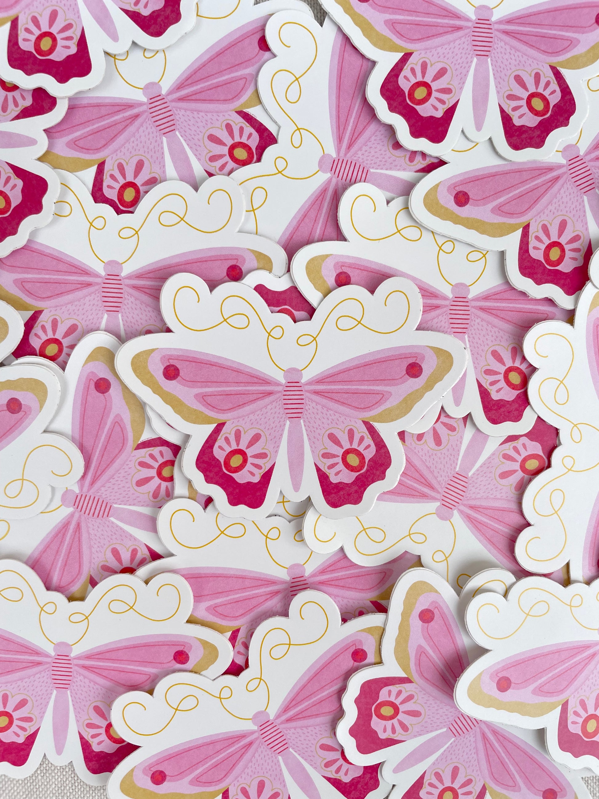 Pink Butterfly Sticker is a matte vinyl sticker of my hand drawn, digital design. It features a Pink butterfly with a colorful pattern design and whimsical antennas.