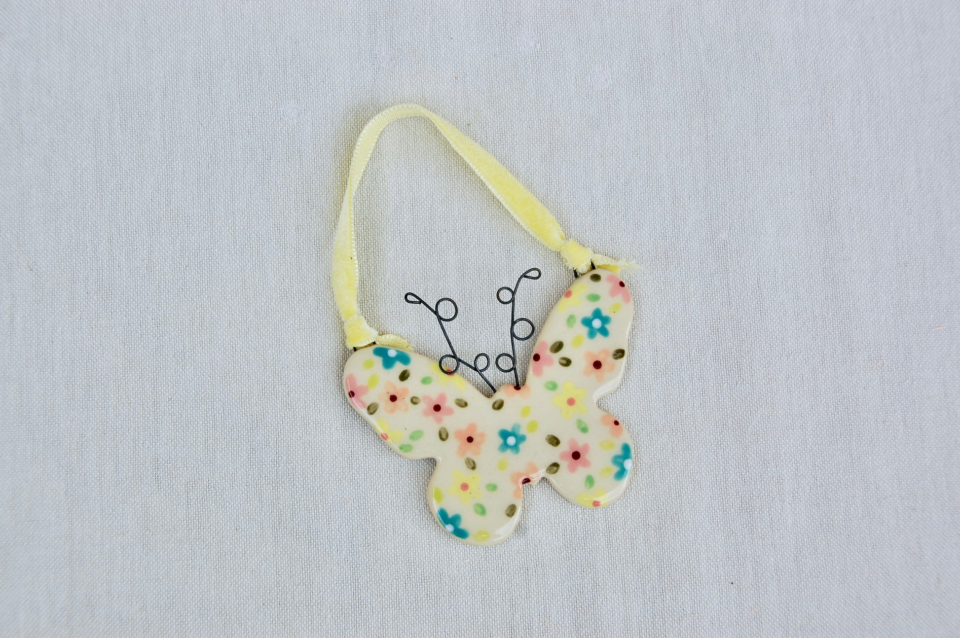 Retro Floral Butterfly Ornament features a hand-painted butterfly with a neon yellow, pink, sherbet, and turquoise floral print with bendable wire antennas! Each ornament comes with a velvet ribbon for easy hanging.