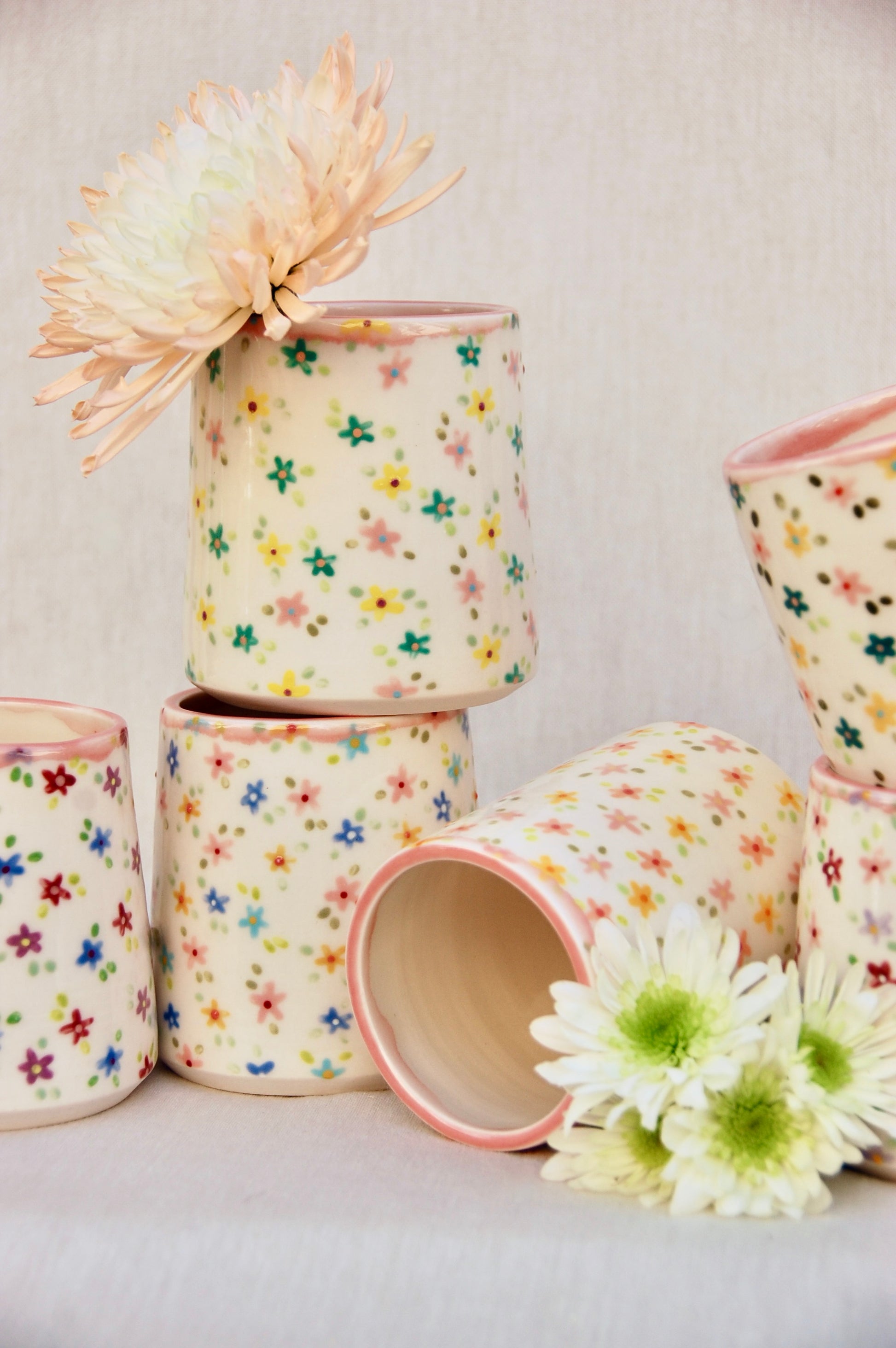 A custom floral mug features a hand-painted cup with your choice of colored flowers (up to 4 colors) with various green leaves. It includes the signature pink rim.