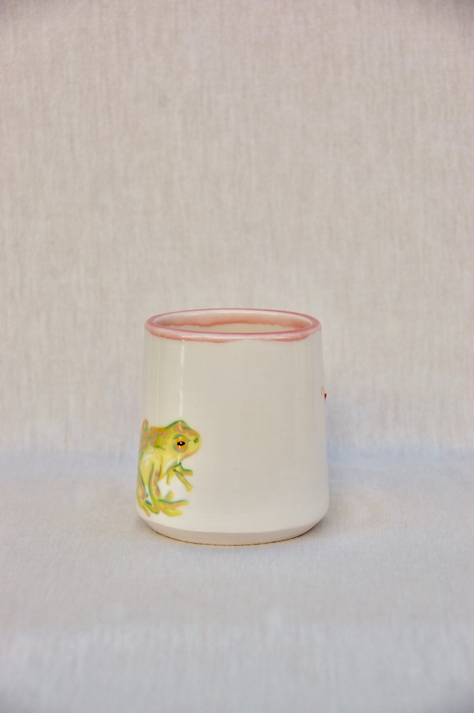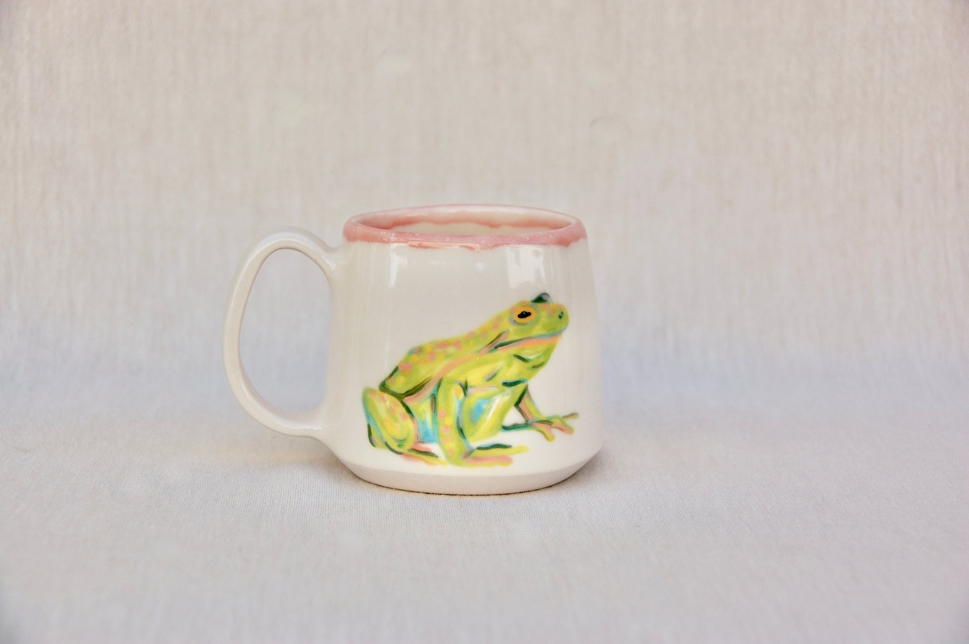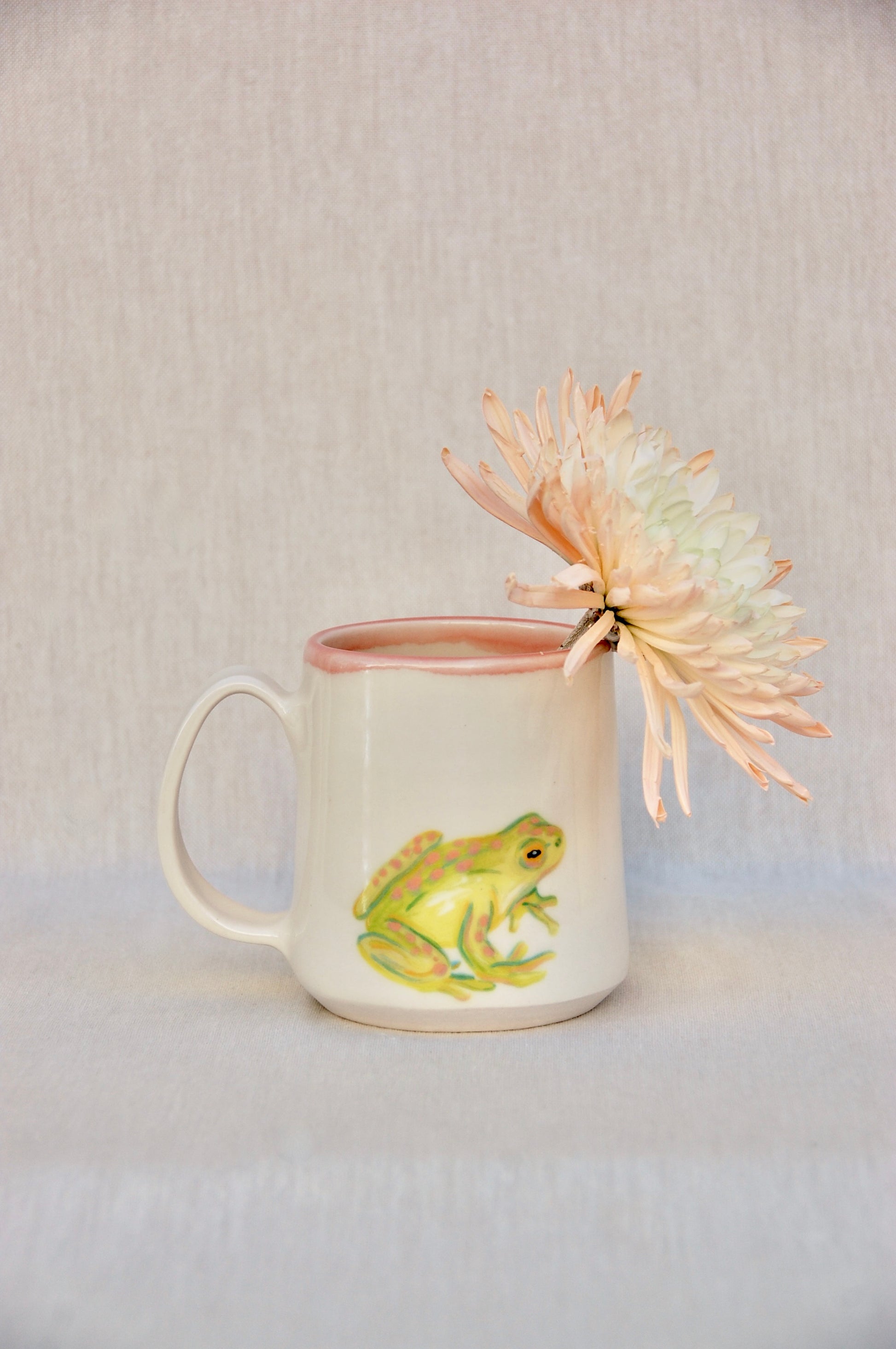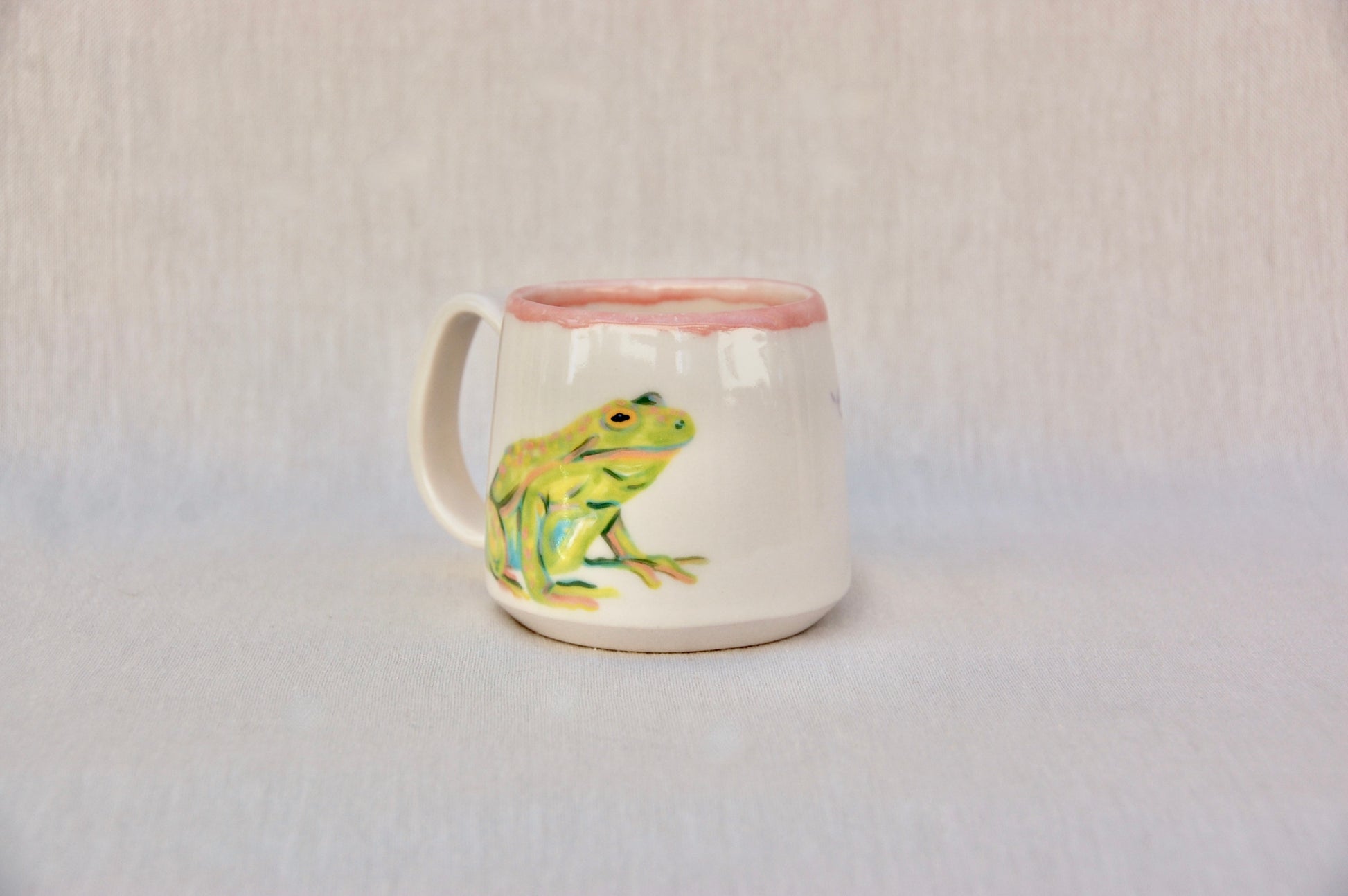 Frog Mug features a hand-painted porcelain frog with a butterfly or bee on the backside.