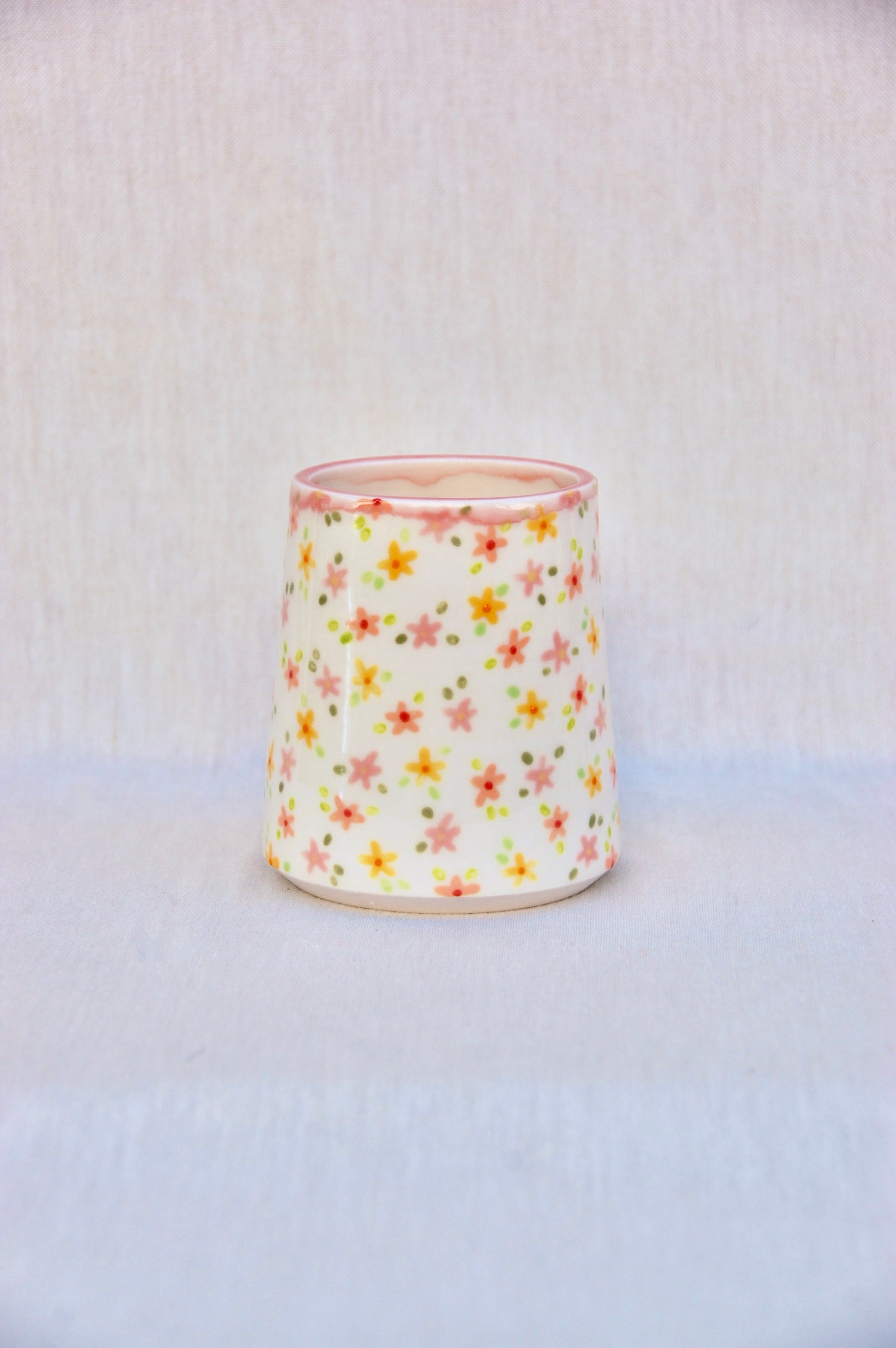 Floral Cup No. 2 features a hand-painted porcelain cup with pink and yellow flowers with various green leaves. It includes the signature pink rim.