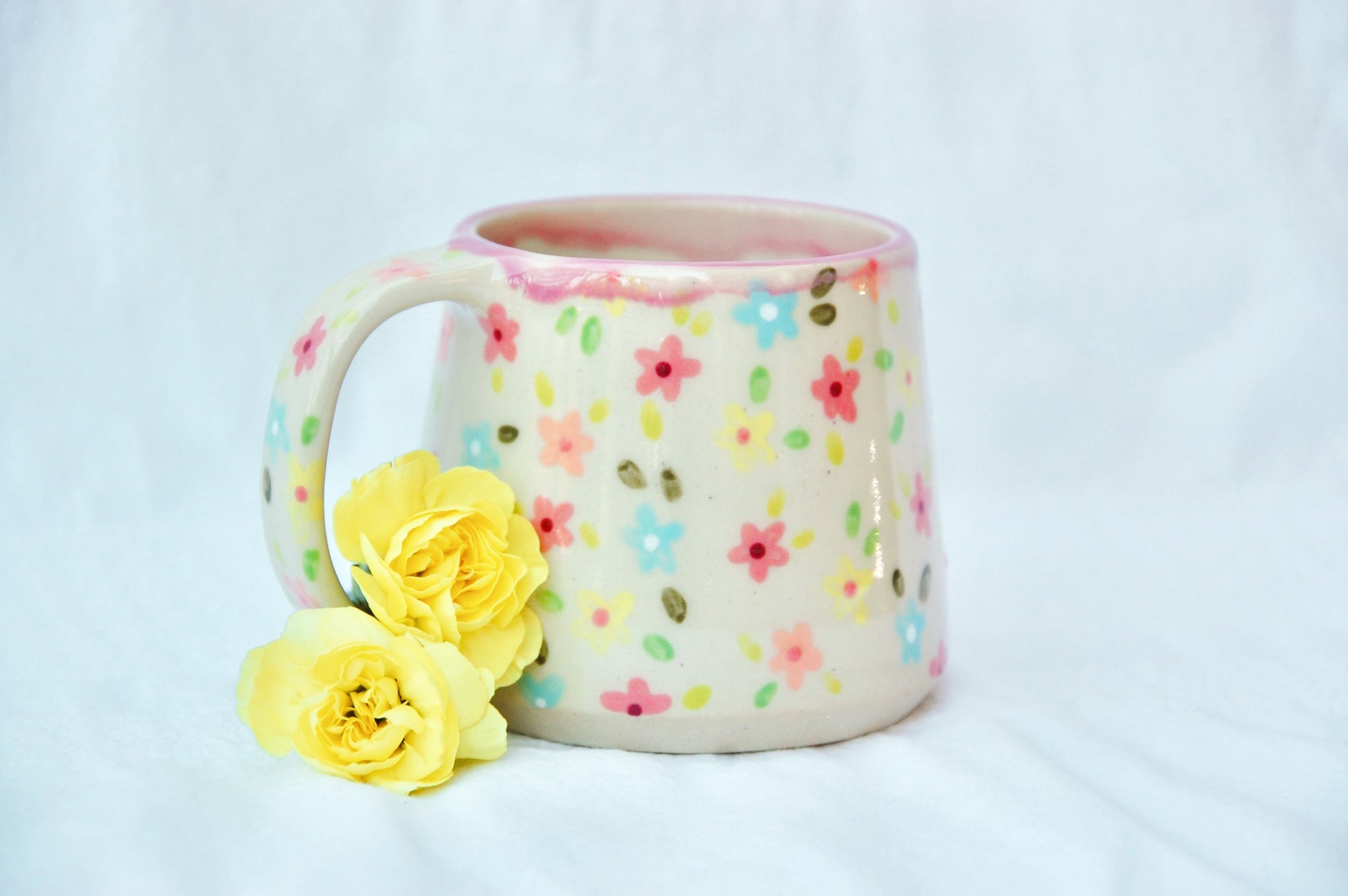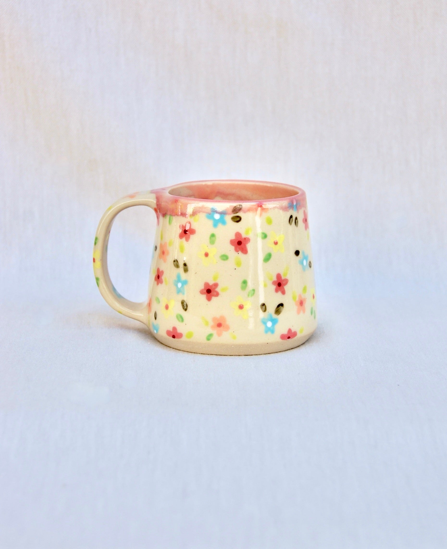 Floral Mug No. 1 features a hand-painted porcelain cup with pink, yellow, and chartreuse flowers with various green leaves. It includes the signature pink rim.