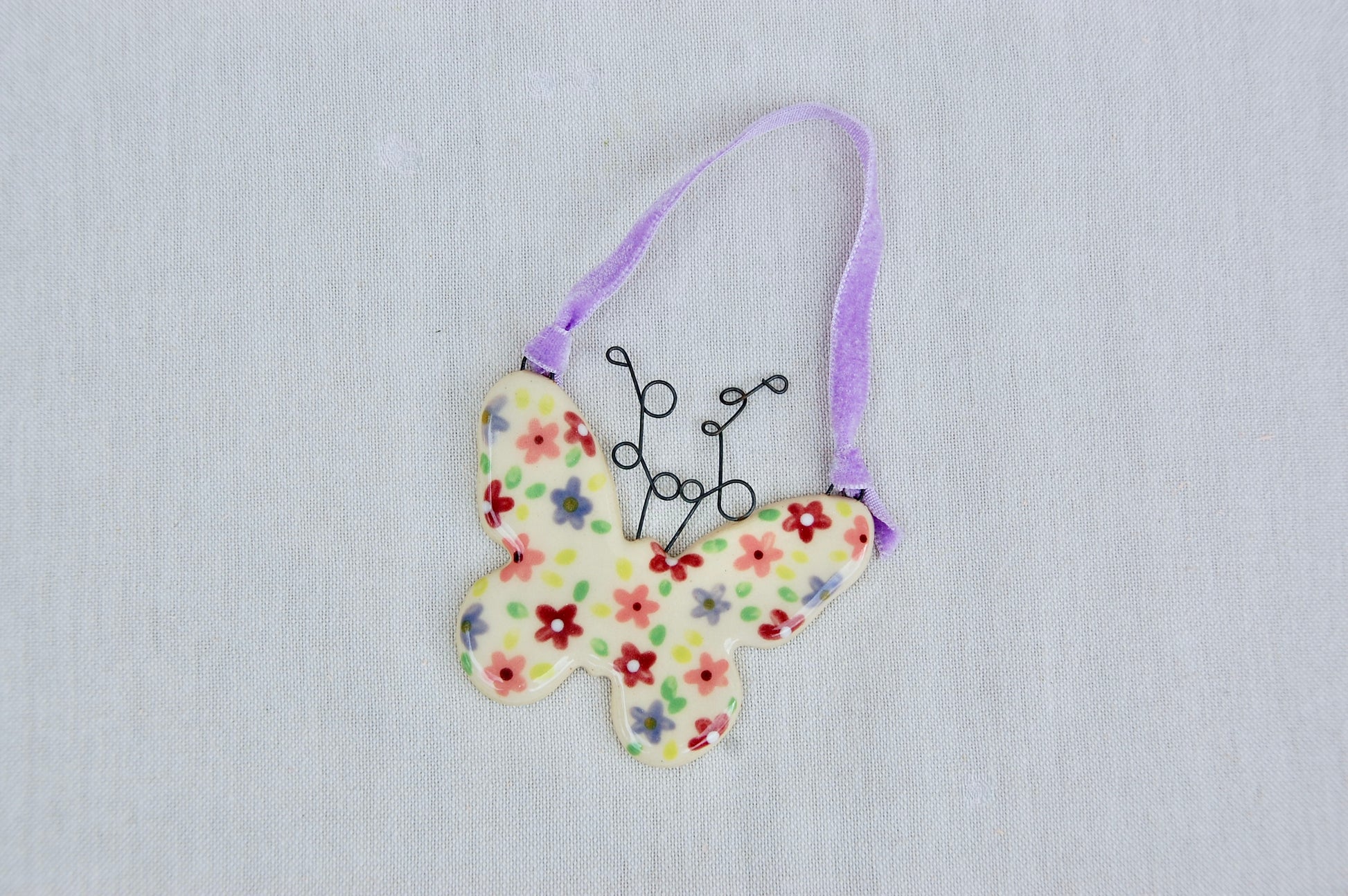 Pink Floral Butterfly Ornament features a hand-painted butterfly with a pink and purple floral print with bendable wire antennas! Each ornament comes with a velvet ribbon for easy hanging.
