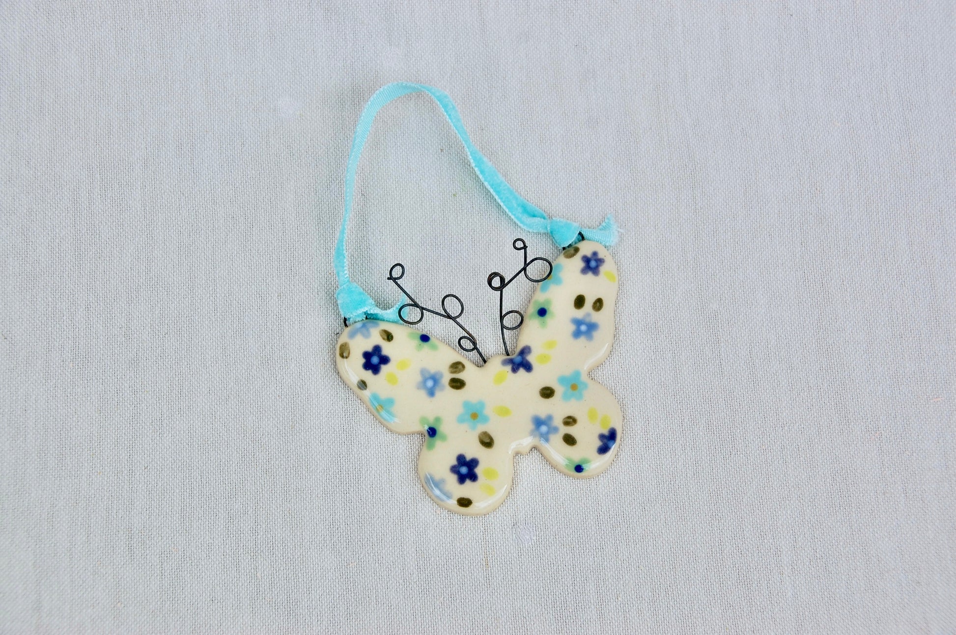 Blue Floral Butterfly Ornament features a hand-painted butterfly with a blue floral print and bendable wire antennas! Each ornament comes with a velvet ribbon for easy hanging.