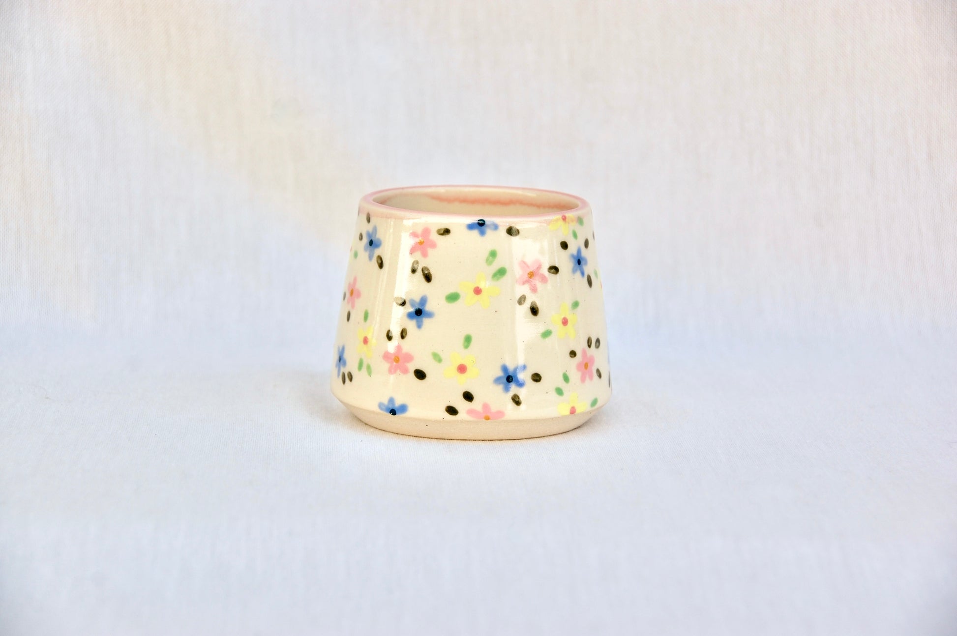 The Breezy Floral Cup features a hand-painted cup with pink, yellow, and breezy blue flowers with various green leaves. It includes the signature pink rim.