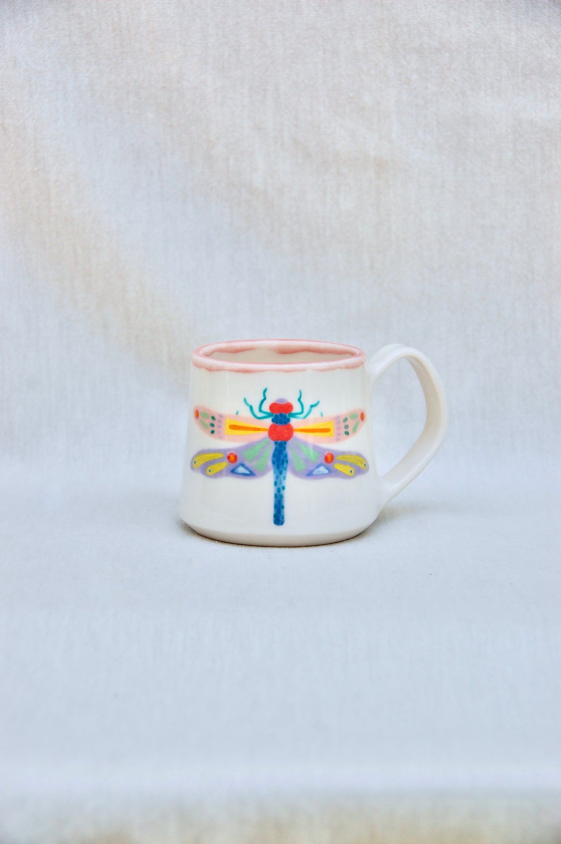 Dragonfly Mug features a hand-painted pink dragonfly with abstract shapes, patterns, and yellow swirly antennas. It includes the signature pink rim.